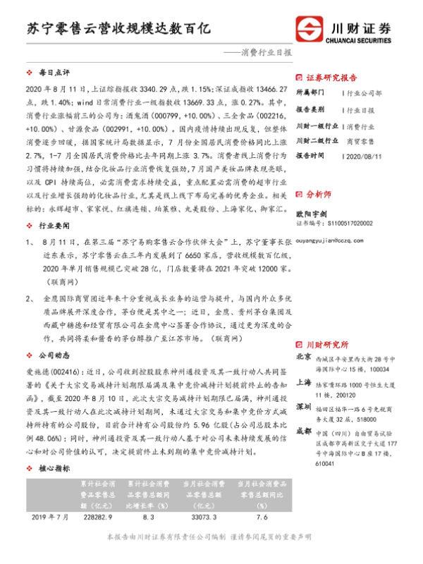 【川财证券】【20200811】消费行业日报:苏宁零售云营收规模达数百亿-3页 证券期货研究报告