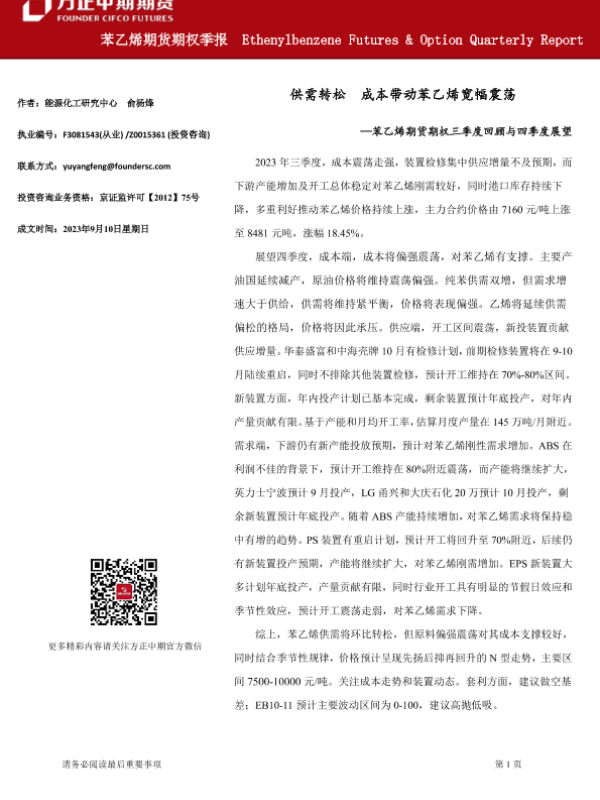 【方正中期期货】【20230910】苯乙烯期货期权三季度回顾与四季度展望:供需转松,成本带动苯乙烯宽幅震荡-25页 行业研究
