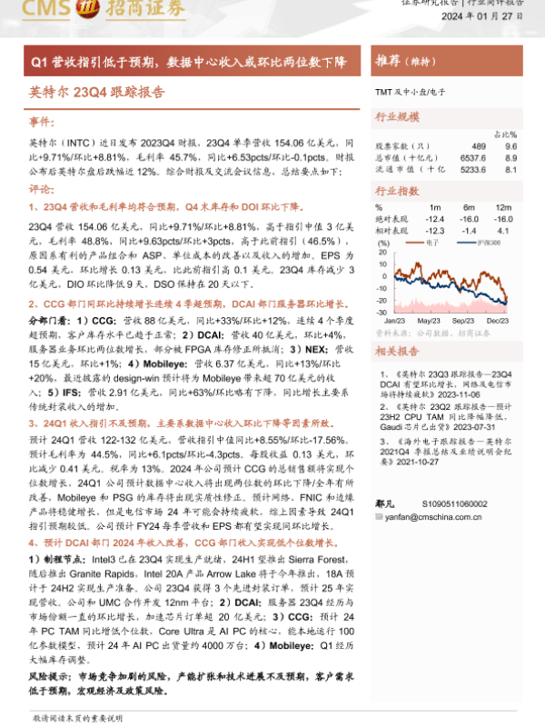 【海通证券】【20240127】英特尔23Q4跟踪报告-Q1营收指引低于预期,数据中心收入或环比两位数下降-14页 行业研究
