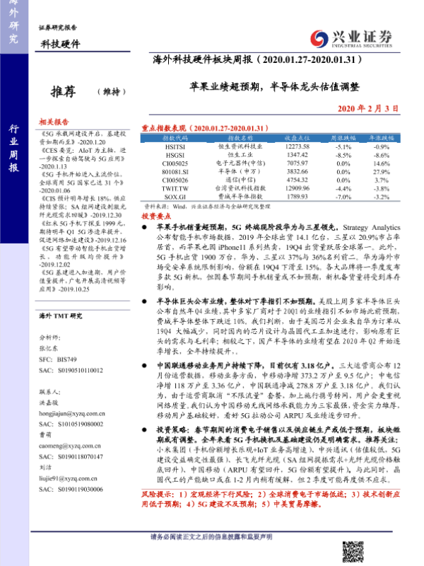【兴业证券】【20200203】海外科技硬件板块周报:苹果业绩超预期,半导体龙头估值调整-16页 行业研究