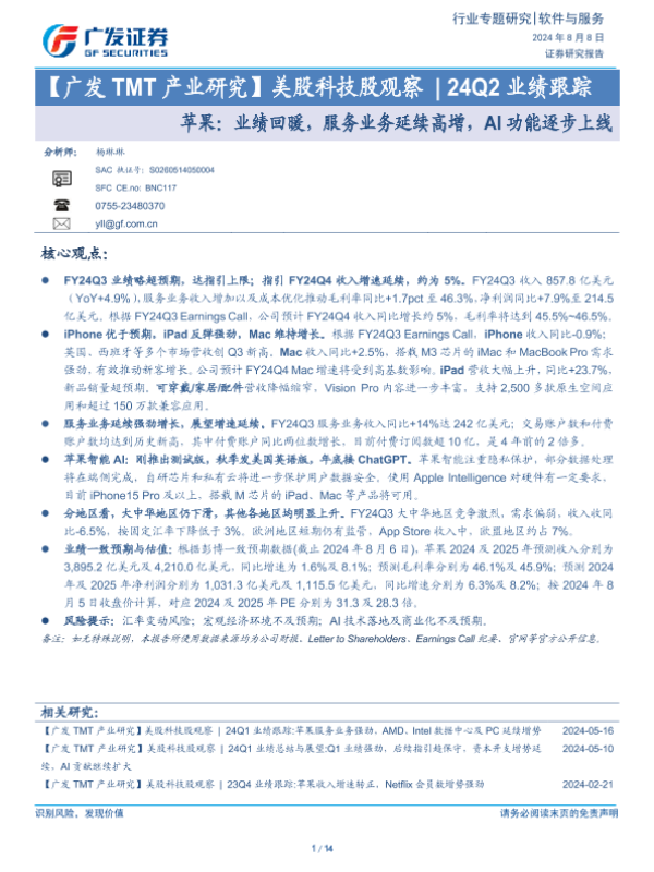 【广发证券】【20240808】美股科技股观察 24Q2业绩跟踪-苹果:业绩回暖,服务业务延续高增,AI功能逐步上线-14页 行业研究