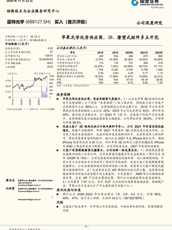 【国金证券】【20201122】国金证券-蓝特光学-688127.SH-苹果光学优质供应商,3D、潜望式组件多点开花-21页 行业研究