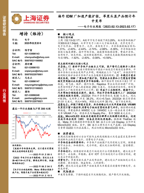 【上海证券】【20230220】电子行业周报:海外IDM厂加速产能扩张,苹果头显产品预计年中发布-12页 行业研究