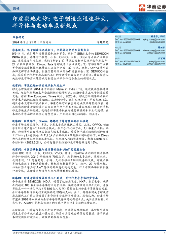 【华泰证券】【20240921】战略专题研究-印度实地走访:电子制造业迅速壮大,半导体与电动车成新焦点-36页 行业研究
