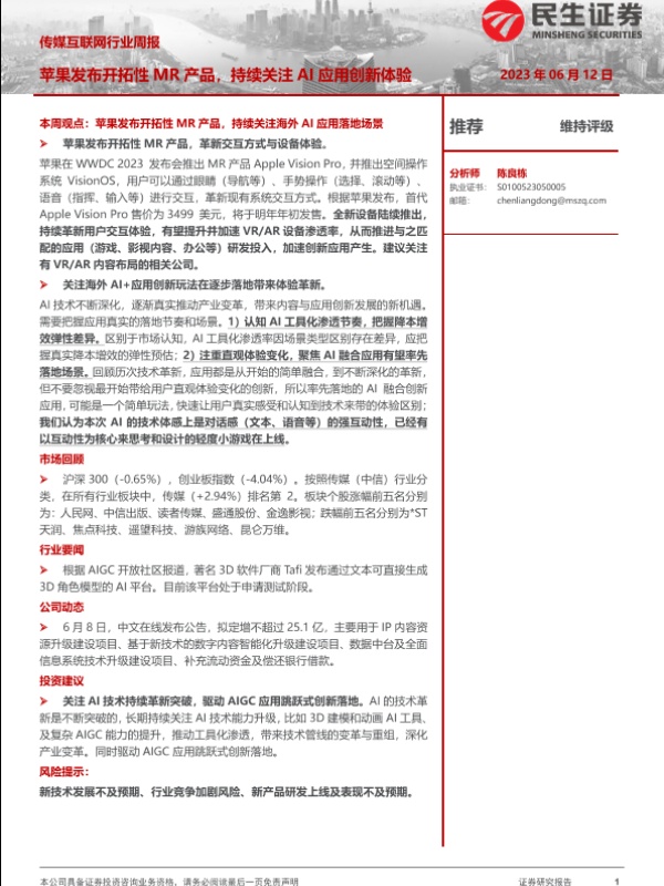 【民生证券】【20230612】传媒互联网行业周报:苹果发布开拓性MR产品,持续关注AI应用创新体验-22页 行业研究