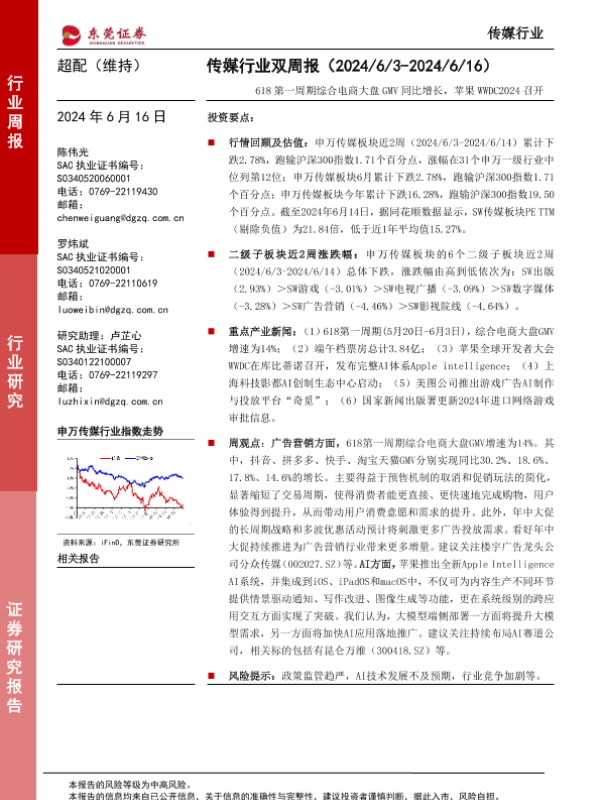 【东莞证券】【20240616】传媒行业双周报:618第一周期综合电商大盘GMV同比增长,苹果WWDC2024召开-12页 行业研究