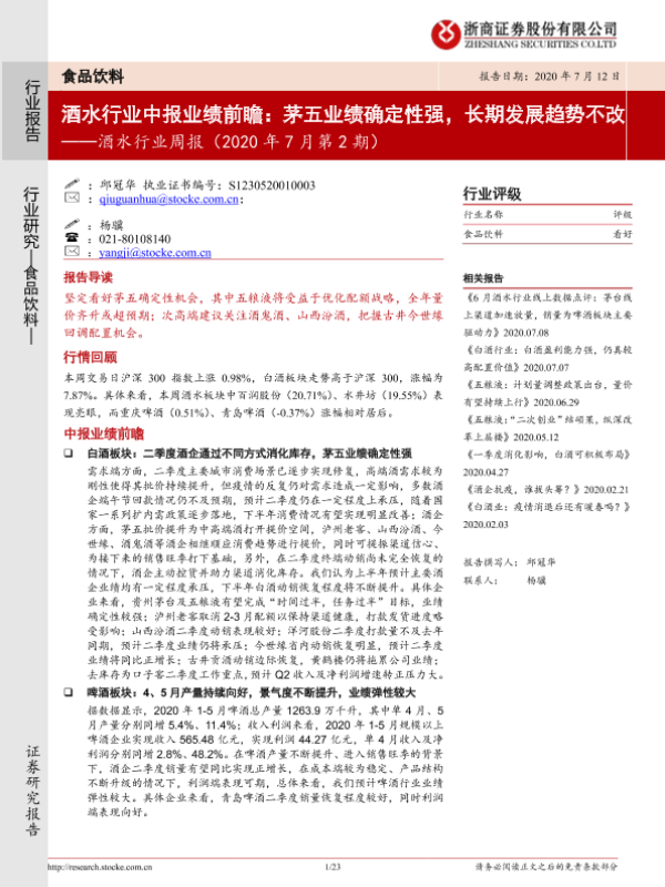 【浙商证券】【20200712】酒水行业中报业绩前瞻:茅五业绩确定性强,长期发展趋势不改-23页 行业研究