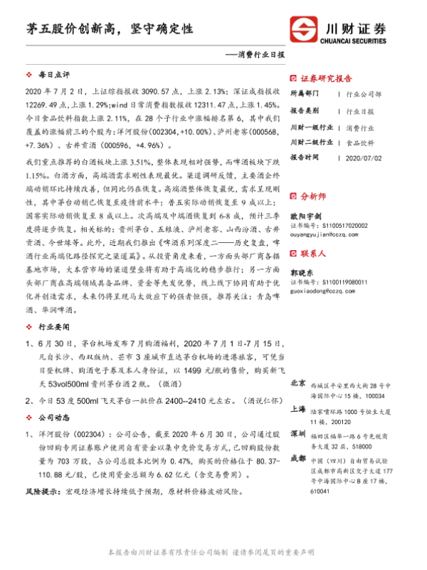 【川财证券】【20200702】消费行业日报:茅五股价创新高,坚守确定性-3页 证券期货研究报告