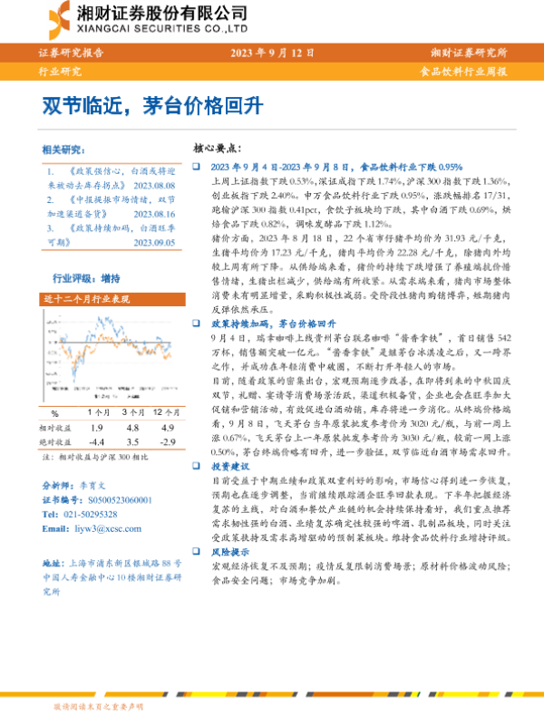 【湘财证券】【20230912】食品饮料行业周报:双节临近,茅台价格回升-10页 行业研究