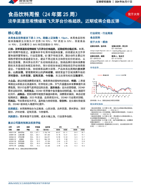 【国信证券】【20240617】20240617-国信证券-食品饮料周报(24年第25周):淡季渠道悲观情绪致飞天茅台价格超跌,近期或将企稳反弹-20页 行业研究