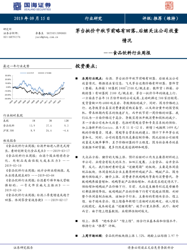 【国海证券】【20190915】食品饮料行业周报:茅台批价中秋节前略有回落,后继关注公司放量情况-19页 行业研究