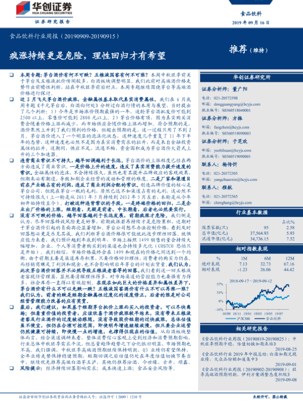 【华创证券】【20190916】20190916-华创证券-食品饮料行业周报:疯涨持续更是危险,理性回归才有希望-22页 行业研究