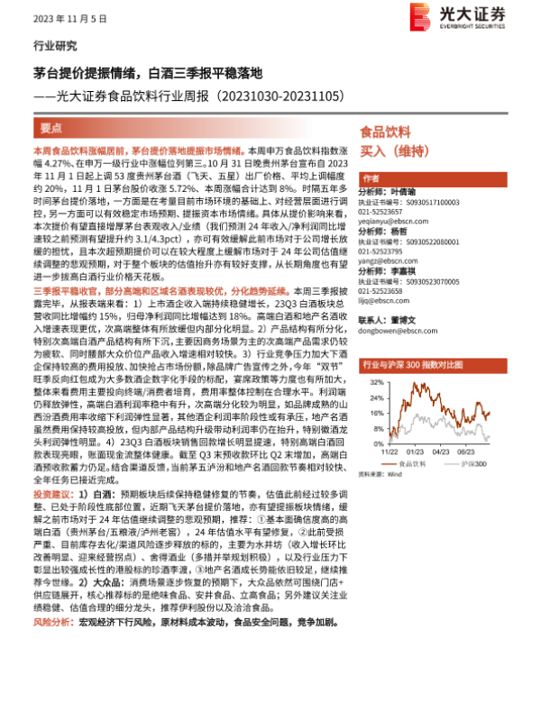 【光大证券】【20231105】20231105-光大证券-食品饮料行业周报:茅台提价提振情绪,白酒三季报平稳落地-10页 行业研究