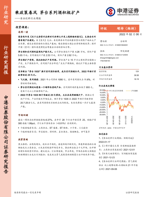 【申港证券】【20220206】食品饮料行业周报:乘政策春风 茅台系列酒积极扩产-9页 行业研究