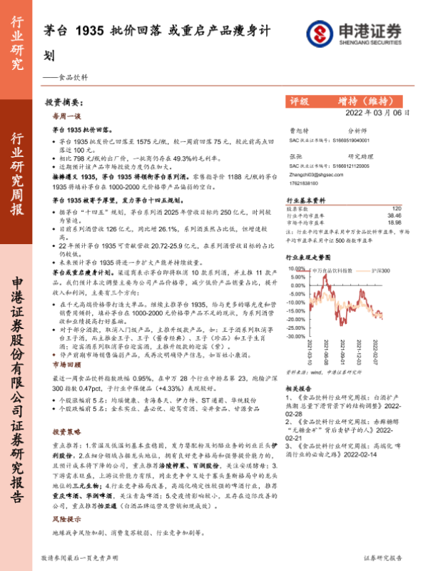 【申港证券】【20220306】食品饮料行业研究周报:茅台1935批价回落 或重启产品瘦身计划-11页 行业研究