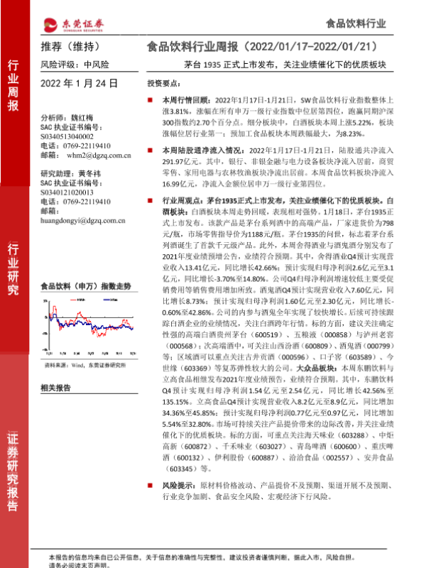 【东莞证券】【20220124】20220124-东莞证券-食品饮料行业周报:茅台1935正式上市发布,关注业绩催化下的优质板块-14页 行业研究