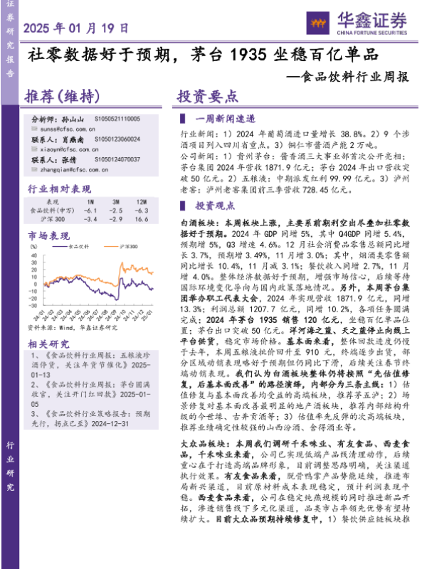 【华鑫证券】【20250119】20250119-华鑫证券-食品饮料行业周报:社零数据好于预期,茅台1935坐稳百亿单品-19页 行业研究