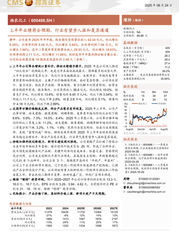 【海通证券】【202508】扬农化工(600486)上半年业绩符合预期,行业有望步入温和复苏通道-15页 证券期货研究报告
