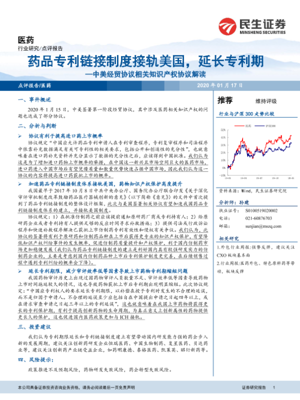 【民生证券】【20200117】中美经贸协议相关知识产权协议解读-药品专利链接制度接轨美国,延长专利期-4页 行业研究