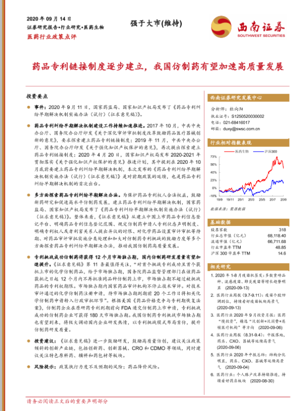 【西南证券】【20200914】药品专利链接制度逐步建立,我国仿制药有望加速高质量发展-3页 行业研究