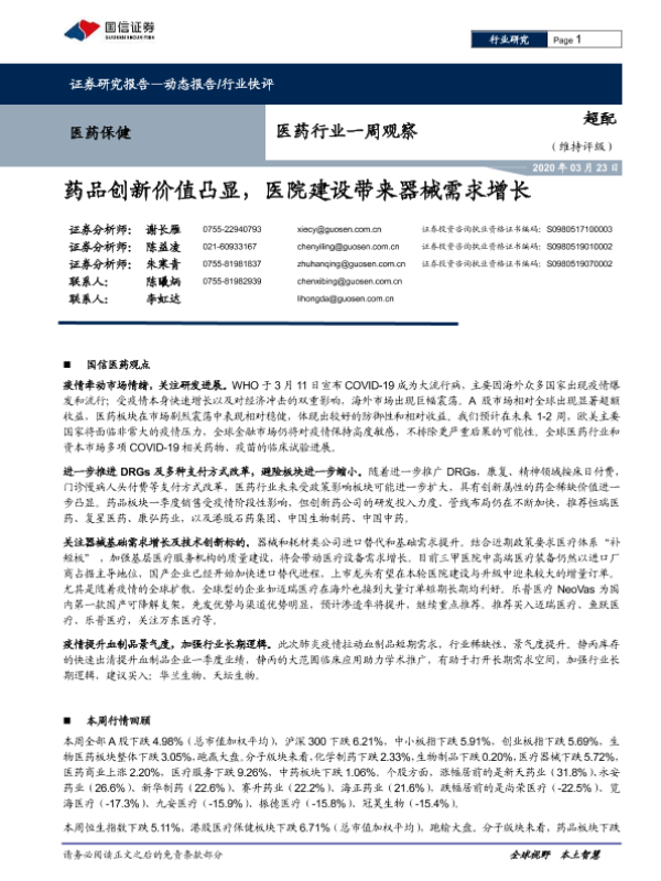 【国信证券】【20200323】医药行业一周观察:药品创新价值凸显,医院建设带来器械需求增长-7页 行业研究