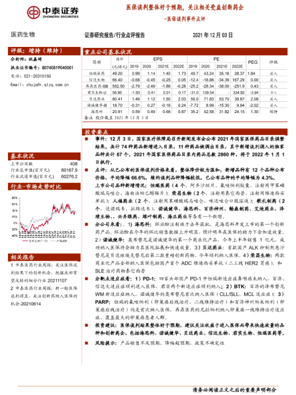 【中泰证券】【20211203】医保谈判事件点评:医保谈判整体好于预期,关注相关受益创新药企-11页 行业研究
