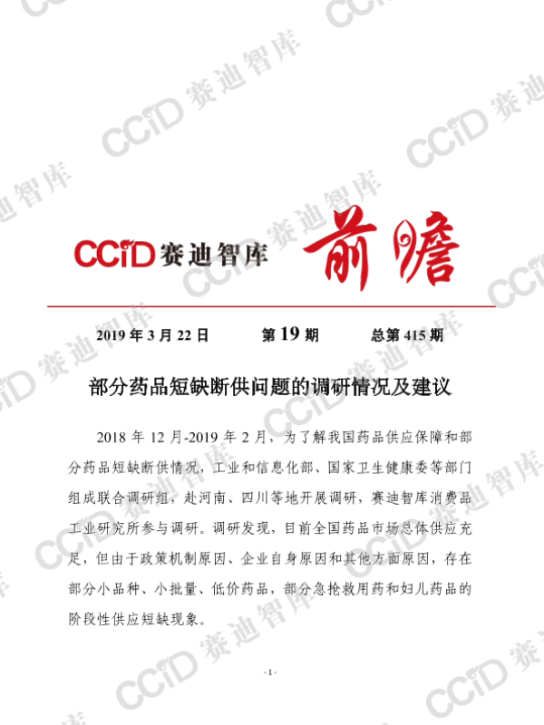 【工业和信息化部&国家卫生健康委】【201903】我国药品短缺相关问题调研情况及建议-7页 市场调研