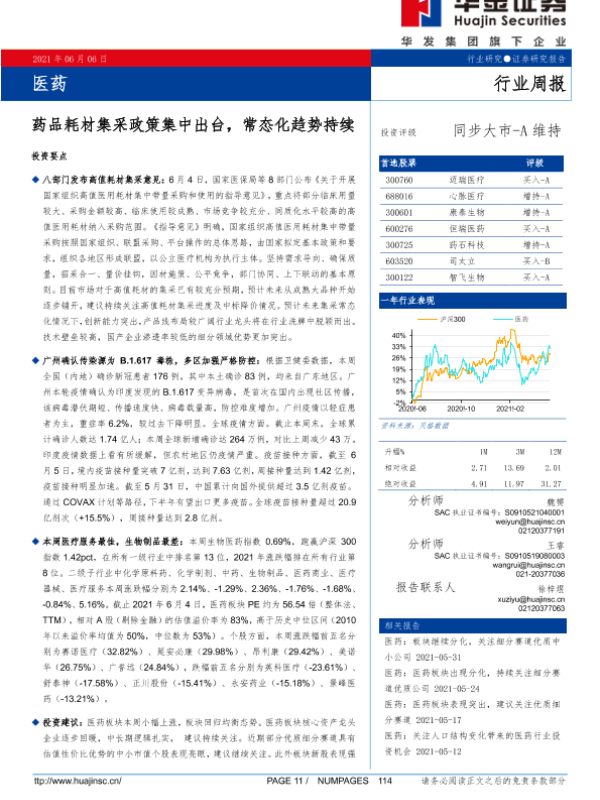 【华金证券】【20210606】医药行业周报:药品耗材集采政策集中出台,常态化趋势持续-16页 行业研究