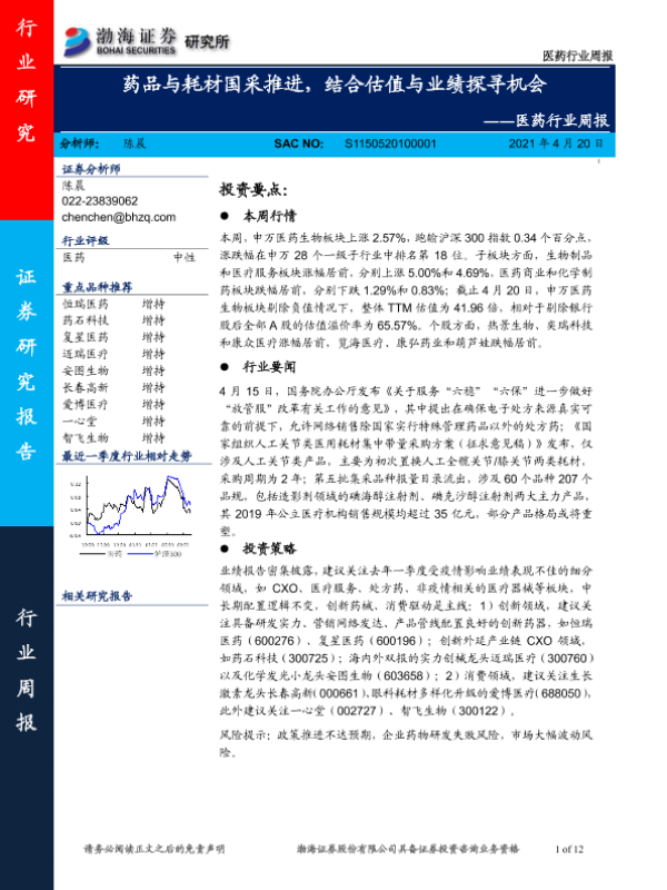 【渤海证券】【20210420】医药行业周报:药品与耗材国采推进,结合估值与业绩探寻机会-12页 行业研究