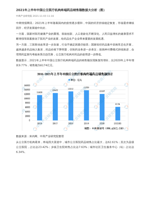 【中商产业研究院】【2021】2021年上半年中国公立医疗机构终端药品销售额数据大分析(图)-3页 行业研究