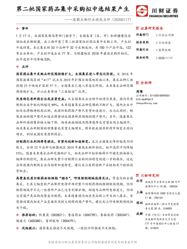 【川财证券】【20200117】第二批国家药品集中采购拟中选结果产生-2页 证券期货研究报告