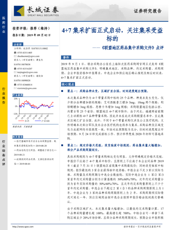 【长城证券】【20190902】联盟地区药品集中采购文件点评:4+7集采扩面正式启动,关注集采受益标的-3页 行业研究