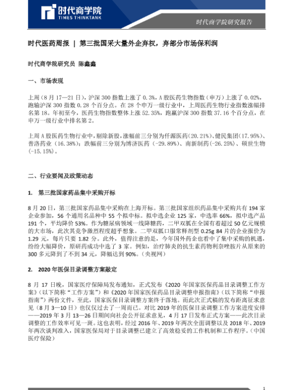 【时代商学院】【20200828】时代医药周报:第三批国采大量外企弃权,弃部分市场保利润-5页 行业研究