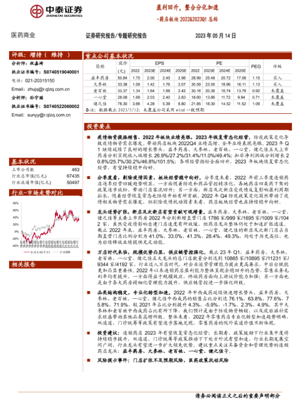 【中泰证券】【20230514】药店板块2022&2023Q1总结:盈利回升,整合分化加速-10页 行业研究