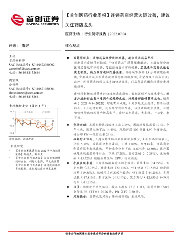 【首创证券】【20220704】连锁药店经营边际改善,建议关注药店龙头-10页 行业研究