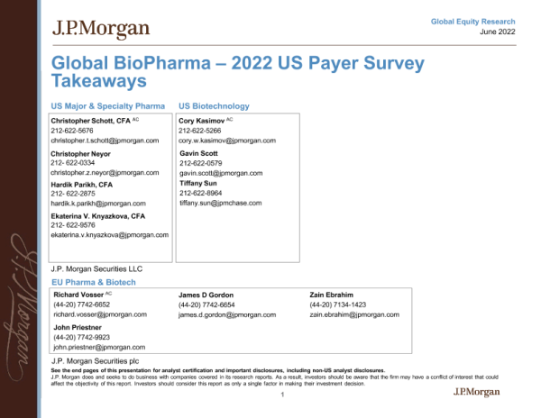 【J.P. Morgan】【202206】全球生物制药业:2022年美国付费者调查的启示-50页 行业研究