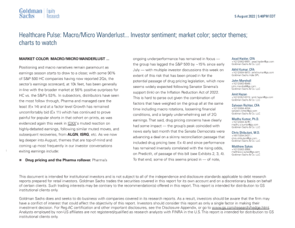 【Goldman Sachs】【20220805】Healthcare Pulse Macro/Micro Wanderlust... Investor sentiment; market color; sector themes; charts to watch-28页 行业研究