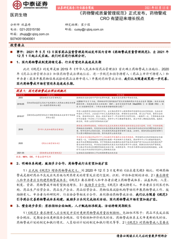 【中泰证券】【20210515】药物警戒质量管理规范正式发布,药物警戒CRO有望迎来增长拐点-3页 行业研究