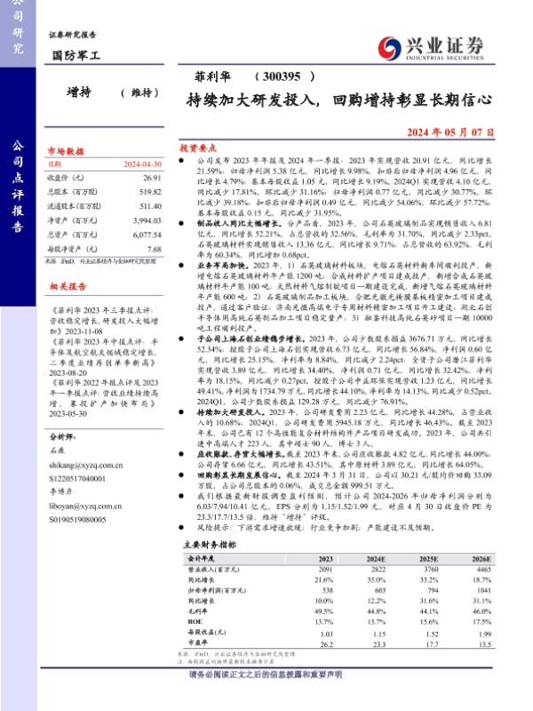 【兴业证券】【20240507】菲利华(300395)持续加大研发投入,回购增持彰显长期信心-10页 行业研究