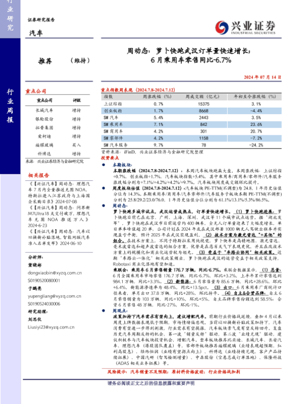 【兴业证券】【20240714】20240714-兴业证券-汽车周动态:萝卜快跑武汉订单量快速增长;6月乘用车零售同比-6.7%-11页 行业研究