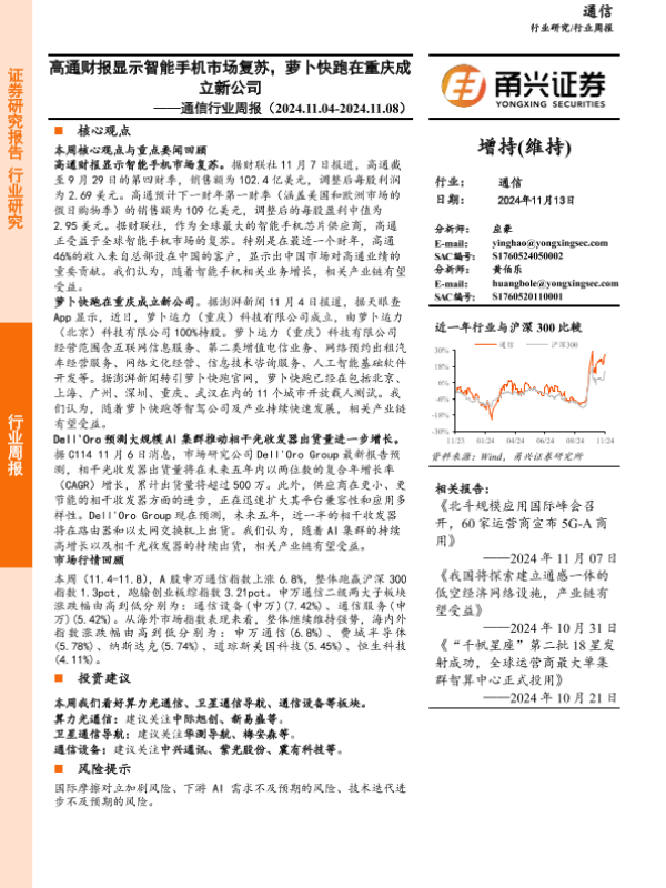 【甬兴证券】【20241113】通信行业周报:高通财报显示智能手机市场复苏,萝卜快跑在重庆成立新公司-12页 行业研究
