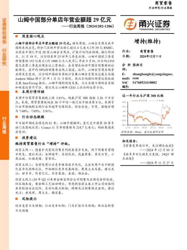 【甬兴证券】【20241211】商贸零售行业周报:山姆中国部分单店年营业额超29亿元-12页 行业研究
