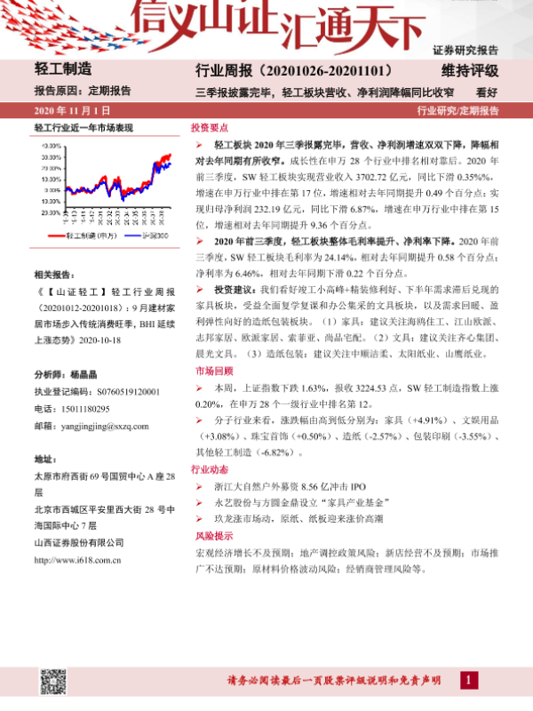 【山西证券】【20201101】轻工制造行业周报:三季报披露完毕,轻工板块营收、净利润降幅同比收窄-14页 行业研究