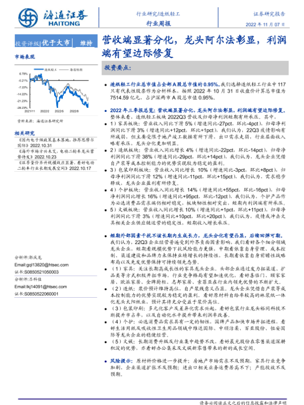 【海通证券】【20221107】20221107-海通证券-造纸轻工行业周报:营收端显著分化,龙头阿尔法彰显,利润端有望边际修复-15页 行业研究