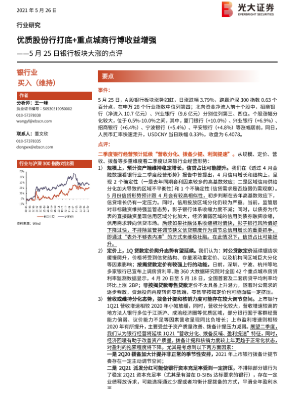 【光大证券】【20210526】5月25日银行板块大涨的点评:优质股份行打底+重点城商行博收益增强-4页 行业研究