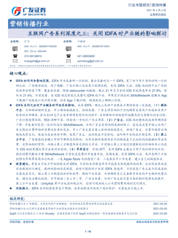 【广发证券】【20210606】营销传播行业:互联网广告系列深度之三:关闭IDFA对产业链的影响探讨-18页 行业研究