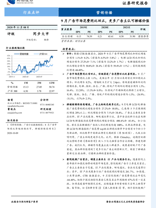 【财信证券】【20201108】20201108-财信证券-营销传播行业点评:9月广告市场花费同比回正,更多广告主认可梯媒价值-3页 行业研究