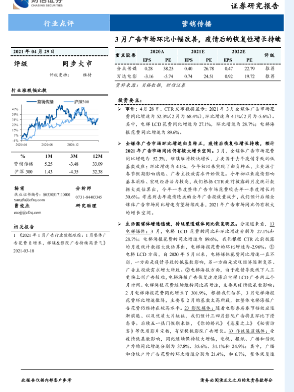 【财信证券】【20210429】营销传播行业:3月广告市场环比小幅改善,疫情后的恢复性增长持续-3页 行业研究