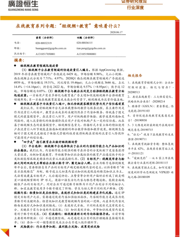 【广证恒生】【20200617】在线教育系列专题:“短视频+教育”意味着什么?-20页 行业研究