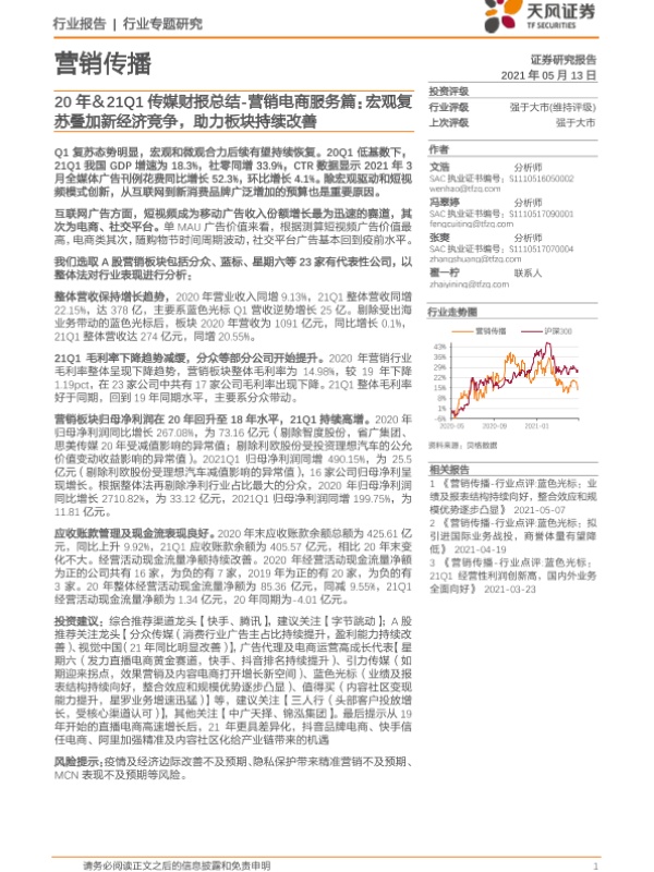 【天风证券】【20210513】20年&21Q1传媒财报总结-营销电商服务篇:宏观复苏叠加新经济竞争,助力板块持续改善-26页 行业研究